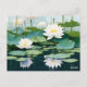 lotus flowers bloom amidst the water lilies. This new illustration style features white flowers and bluish-green lotus leaves against a white background. Elegant, simple, and floral postcard.