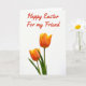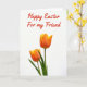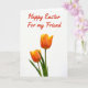 This design shows two flowers set low on a bright white background, arranged like close companions leaning toward each other 🌷. The right bloom sits slightly forward, its petals shifting from deep orange near the base to soft golden yellow at the edges, like a warm blush shared between friends. To the left, a second flower appears a bit farther back and slightly softer in focus, creating a gentle sense of distance while still keeping the pair connected. Slim green stems rise upward with pointed leaves, adding crisp contrast and guiding the eye back to the blossoms. Soft, diffused light reveals the petal curves and subtle texture, giving the scene a calm, affectionate mood without crowding the space. Near the top, a short greeting is placed in a flowing, handwritten-style red line, standing out clearly against the white. The lettering sits centered above the flowers, leaving plenty of open space around it so the message feels airy and easy to read 🐇. The left flower’s edges are slightly blurred compared with the sharper right bloom, and both stems angle upward from the lower margin with two narrow leaves pointing diagonally outward.