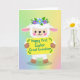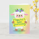 This card features a fluffy, lamb-like cartoon animal with rounded shapes and a soft white look, gazing forward with small black eyes, a gentle smile, and rosy cheeks that feel like a sweet, friendly hello. A ring of tiny blue and purple flowers with green leaves rests on its head, adding a spring touch 🌷. The character holds a sunny yellow sign close to its chest, as if offering it to someone special with quiet affection. Centered on the sign, the message “Happy First Easter Great Grandson” appears in a friendly green font, standing out clearly against the yellow. Small leafy sprigs decorate the corners of the sign, echoing the floral crown above. Behind everything is a pastel rainbow background that blends softly through pale green, light yellow, calm blue, and gentle pink, giving the scene a light, airy feel 🐰. The overall layout keeps the character centered with the sign in front, while the soft gradient fills the entire backdrop. The yellow sign sits against the smooth rainbow wash, with green lettering and tiny leaf accents framing the words.