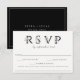Modern and trendy black and white floral RSVP letters with solid black color backing and white frame accent, wedding RSVP cards with food allergy/dietary restriction note for guests. Elegant letters feature delicate black and white line art flowers and foliage.