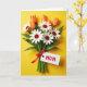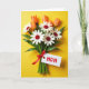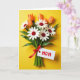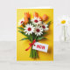 This card features an overhead view of a neatly arranged bouquet set on a bright yellow background, with a tender, affectionate feel in the way each flower seems carefully placed for someone special ❤️. White, daisy-like blooms with deep red, textured centers sit in the middle, surrounded by closed buds that shift from warm orange to soft peach. Rich green stems and leaves gather below, creating a grounded base against the sunny backdrop. A smooth red satin ribbon is tied into a tidy bow around the stems, adding a romantic touch like a thoughtful gift waiting to be handed over. A small white tag hangs from the ribbon, carrying the main message in red lettering, positioned so it stands out without covering the flowers. The lighting is soft and even, keeping shadows minimal and letting the petal textures and glossy leaves show clearly 🌼. The tag sits near the lower portion of the bouquet, with red text centered on the white space beside the bow.