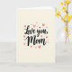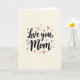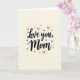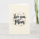 This greeting card features the words “Love you, Mom” centered in thick, flowing black lettering that feels gently hand-drawn, as if written with care for someone close ❤️. The message sits prominently in the middle of a warm cream background with a soft, painterly texture that keeps the scene cozy and intimate. Small heart shapes are sprinkled around the text, creating the look of affection drifting across the page rather than a stiff, formal layout. The hearts vary in size and color, moving from pale pink to deeper rose and burgundy tones, like a quiet build of closeness and devotion. Some hearts cluster near the lettering while others float outward, giving the design a relaxed balance that feels like an easy hug. The text is dark and easy to read, with the surrounding hearts acting like a gentle frame instead of a heavy border 🌼. The off-white backdrop stays simple so the black message and rosy hearts stand out clearly. Several tiny hearts trail diagonally across the cream space, mixing soft pink and deep burgundy accents around the central words.