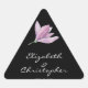 Personalized triangle stickers featuring a beautiful purple magnolia blossom watercolor and your text in chic white lettering on a black background, perfect for wedding party favors, bridal shower, wedding invitation seals and more. Available in different shapes. MATCHING ITEMS in our store.