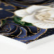 A funeral welcome sign or focal point during a memorial service/wake, featuring navy and white floral roses with green foliage and accents of faux gold, a photograph of your loved one, their name and dates.