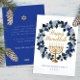 Celebrate Hanukkah with grace and tradition using this beautiful holiday card featuring a golden menorah encircled by a lush watercolor floral wreath in blue, navy, and blush. The elegant gold script greeting and fully customizable message on the back make it perfect for sending warm wishes to friends and family. Personalize with your family name and year to create a meaningful keepsake they’ll cherish.