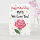 This card features a single red rose centered near the bottom, outlined in white so the petals stand out with a gentle, affectionate look ❤️. A green stem rises from the flower with one curved leaf, keeping the layout simple against a white background. Near the top, the first line of text sits in red and reads like a cheerful announcement of the day. Directly below, a larger line of black text addresses “MiMi,” giving the words extra emphasis and a close, family-to-family warmth. The spacing leaves plenty of open white area, so the rose and message feel like they’re leaning toward each other rather than competing. Small round dots are scattered around the page like confetti, adding a friendly, celebratory mood 🌼. The dots come in soft peach, light yellow, and pale aqua, and they’re sprinkled mostly around the upper and side areas. The rose’s red bloom sits low on the page with crisp white edging, while the pastel polka dots float across the white space above it.
