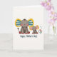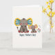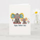 Designed with a tender scene of two elephant-like characters, the front shows a larger grey figure on the left and a smaller companion nestled close on the right, their wide eyes meeting with a gentle, caring look ❤️. The larger one has big ears edged in yellow, filled with blue-and-white stripes and tiny multicolored flower details that add a soft, affectionate charm. The smaller figure mirrors the pattern but with warmer pinks and yellows inside its ears, like a cozy echo of the one beside it. Both have a faint rosy blush on their cheeks and little curled trunks that angle toward each other, suggesting quiet closeness. The background stays plain white so the colors and shapes stand out without distraction. Beneath the pair, a short line of dark lettering sits centered near the bottom, with the text in a flowing style that contrasts against the white space. Small red accents color their feet, and a little cluster of red and blue flowers 🌼 rests to the right of the characters. Share your Mother’s Day sentiments with someone special.