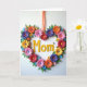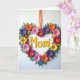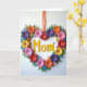 This card features a heart-shaped wreath made from many paper flowers, hanging from a soft peach ribbon against a white background. At the center, chunky yellow letters spell “Mom,” and their raised look adds a sweet, cozy focus ❤️. Around the word, layered petals in purple, orange, yellow, pink, red, and blue cluster closely together, like a garden arranged with extra care. Small green leaves peek between the blooms, giving the wreath a fuller, more natural texture. Two tiny yellow-and-black flying insects sit along the floral edge, as if they’ve drifted in to keep the scene company 🌼. The lighting is gentle and slightly shadowed, making the petals and letters look more sculpted and touchable. The “Mom” text sits right in the middle of the wreath in bright yellow, while the rest of the space stays plain white so the colors stand out. The peach ribbon loops upward from the top point of the heart, with a faint shadow falling just behind it.
