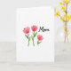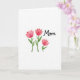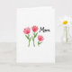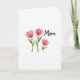 This card features three stylized watercolor blossoms in soft coral and rosy pink, with layered petals that feel like they’re leaning toward one another in quiet affection ❤️. Each flower rises on a slim green stem with small pointed leaves, adding a gentle, growing-from-the-heart look. Two taller blooms stand together on the left, while a slightly shorter bloom sits to the right, like a close friend tucked in beside them. In the upper right area, the word “Mom” appears in flowing black lettering, standing out clearly against the white space. The text is placed high and slightly right to balance the cluster of flowers below and left. The background stays crisp white, letting the warm petals and fresh greens feel airy and calm, like a small bouquet offered with care 🌼. Subtle watercolor variations and softly uneven edges show through in the petals and stems, with tiny shifts in pigment near the leaf tips and along the flower outlines.