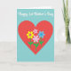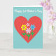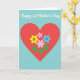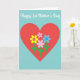 This card features a large crimson heart centered on a calm sky-blue background, setting a sweet, affectionate scene ❤️. Inside the heart, a small bouquet of simple flowers leans together as if sharing a quiet, friendly closeness. Three main blossoms rise on green stems: one yellow with a pink center, one light pink with a deeper pink center, and one light blue with a darker blue center. A smaller fuchsia flower sits just above the larger pink bloom, like a tiny companion tucked in for support 🌼. Near the top, a short celebratory message appears in white, flowing cursive-style lettering, arcing gently above the heart. The text stands out clearly against the blue and leaves the heart as the main focus below. The flowers are flat and lightly detailed, with rounded petals and smooth shapes layered neatly within the heart.