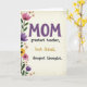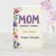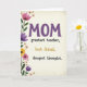 This card features a vertical layout with a creamy off‑white, lightly textured background that feels soft and cozy. At the top, the large word “MOM” sits centered in rounded purple lettering, immediately drawing the eye. Under it, three short lines are stacked neatly: “greatest teacher” in simple black text, “best friend” in warm gold, and “cheapest therapist” in black, adding a gentle wink of humor ❤️. Along the left edge, a flowing column of painted flowers and leafy stems frames the words like a quiet hug, suggesting closeness and long talks shared over time. The blossoms mix soft pink, lilac, sunny yellow, and peach tones, with fresh green foliage that keeps the design light and affectionate 🌼. The text stays mostly centered while the floral border leans inward, creating a tender, companionable balance between message and decoration. The left margin is filled with layered blooms and slender green stems that trail upward beside the purple “MOM.”
