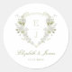 Elegant wedding envelope seals, embellished with a stunning green and white watercolor floral monogram crest and classic calligraphy.