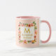 Add a touch of elegance to your morning ritual with our Personalized Floral Monogram Mug. This beautifully crafted ceramic cup features a delicate wreath of peach and pink blossoms surrounding a bold, golden initial and custom name. With its charming pastel-pink interior and matching handle, this mug is as stylish as it is functional.