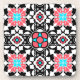 Coasters as an Art Deco Moroccan tile pattern based on stylized flowers and leaves - classic black and white with coral pink, accented with turquoise blue