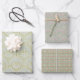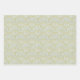 The three floral wrapping paper sheets are 3 color variants of the Morris wallpaper pattern "Michaelmas Daisy", by J.H. Dearle, from 1912, now in the public domain now. The first has blue flowers, the second pink flowers, the third smaller red flowers, all of them surrounded by green leaves.