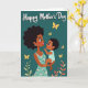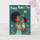 On the front of the card a woman with a warm complexion and full dark curls holds a baby close, meeting the child’s wide-eyed gaze with a soft smile that feels tender and affectionate ❤️. The baby leans toward her with an outstretched hand, as if reaching for her cheek in a quiet, trusting moment. Behind them, a deep teal background keeps the focus on their faces and the closeness of their pose. She wears a sleeveless dress covered in small white and pale blue flowers, while the baby is dressed in a simple mint green outfit. Golden-yellow butterflies with small pink accents drift around them, adding a gentle sense of motion and lightness 🌼. In the lower corners, scattered leaves and plant shapes in cream, orange, and soft green create a cozy garden-like setting. Near the top, a message appears in white flowing lettering with a faint shadow, centered above the illustration. The butterflies arc across the teal space, with a few hovering near the upper right and others floating closer to the mother’s shoulder.