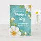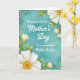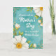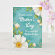 This card features a soothing muted aqua background with a soft watercolor-like texture, setting a calm, affectionate tone ❤️. Centered on the front is a white message that reads, “A special wish on Mother's Day To a wonderful Mother In Law,” arranged in stacked lines for easy reading. The lettering sits prominently in the middle, standing out clearly against the cool teal field. In the top-right and bottom-left corners, large white daisy-like flowers lean inward as if gently framing the words, their warm yellow centers drawing the eye. Slender green leaves and small budding accents with touches of orange weave along the edges, adding a friendly, springtime feel 🌼. A thin decorative border traces the rectangle, dotted with tiny golden-yellow circles that echo the flower centers. The overall palette stays balanced between cool aqua, bright white petals, and soft gold details, with the flowers angled toward the center text. The top-right bloom shows layered white petals around a round golden center, with a few green leaves curling toward the border.