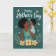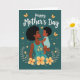 This design shows a dark-skinned woman with full curly hair cradling a round-faced baby close, their eyes meeting with a tender, affectionate look ❤️. The background is a deep teal, giving the scene a calm, intimate setting that draws you toward their faces. A small gold earring catches the light near her cheek, and both figures have rosy cheek touches and softly colored lips. Around them, yellow-orange flowers and green leaves rise from the bottom and curl along the sides like a garden frame, adding a gentle, romantic softness to the moment. Small orange butterflies drift across the scene, bringing a light, airy motion 🌼. Near the top, a short greeting appears in white lettering, centered above the figures and easy to read against the dark background. The color palette stays warm and balanced, with the florals echoing the baby’s blush tones and the teal making the skin and hair stand out. The blossoms cluster most densely along the lower edge, with leaves and petals reaching upward toward the corners.