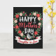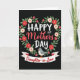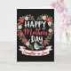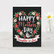 This Mother's Day card features a deep black background that makes the central lettering glow with a romantic, cared-for look ❤️. In the middle, “HAPPY” appears in bold white letters, with “Mothers Day” written beneath it in flowing coral-red lettering, and a small “1st” tucked close to the main phrase. Surrounding the words is a symmetrical wreath shaped like a heart, suggesting an embrace through its gentle curve. The wreath is filled with stylized coral and soft cream flowers, their petals shaded for depth, and threaded with sage-green leaves and thin winding vines. Near the bottom, a white ribbon banner stretches across the card, carrying a short closing line in rich red lettering. Resting on the top edge of the ribbon is a small bird in slate blue and cream, with a bright orange beak and feet, like a quiet companion watching over the message 🌼. The floral heart frame sits centered above the ribbon, with the bird perched slightly to one side on the banner.