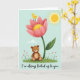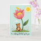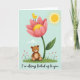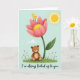 Designed with a dreamy spring scene, this card centers on a huge flower with dusky pink petals and a sunny yellow middle, standing tall like a gentle guardian. A small yellow bird rests on top, leaning forward as if sharing a quiet moment with the figures below. On a bright green patch of grass, a soft brown teddy bear sits with a calm face, looking upward with the kind of tender attention you’d see between close friends ❤️. The background is a pale pastel sky with one rounded cloud and a simple sun sending out warm rays, keeping the mood light and affectionate. Scattered across the ground are tiny heart-shaped flowers that echo the bear’s fond gaze and add a subtle romantic touch 🌼. Along the bottom edge, the message “I’ve always looked up to you” is placed in a dark, easy-to-read line that stands out against the lighter background. The sun is drawn as a small yellow circle near the upper corner with short rays fanning outward.