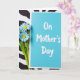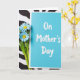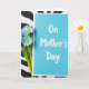 This card features an aqua-blue rectangle on the right, paired with a small bouquet of daisy-like flowers on the left, creating a sweet, companionable scene ❤️. The blossoms have soft sky-blue petals with sunny yellow centers, and their green stems lean gently toward the card as if drawn to it. Across the front of the card, the words “On Mother’s Day” sit centered in white lettering, standing out clearly against the cool background. The arrangement lies flat on a backdrop of wavy black-and-white stripes, adding motion and contrast around the calmer card and flowers. The striped pattern frames the items like a lively stage, while the flowers’ slight overlap suggests a tender, thoughtful gesture 🌼. Soft, even lighting highlights the smooth card surface and the delicate edges of each petal without harsh shadows. The black-and-white stripes ripple behind everything in wide, undulating bands.