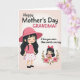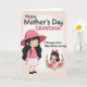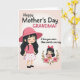 This card features a stylized adult woman on the left wearing a wide-brim pink hat, a matching pink top, and a white skirt with pink polka dots, her long dark hair framing rosy cheeks and a bright, welcoming smile ❤️. Her relaxed pose and gentle expression suggest she’s looking toward someone she adores, adding a quiet sense of closeness to the scene. On the lower right, a smaller young girl appears inside a leafy green wreath dotted with small pink blossoms, as if she’s been lovingly placed there like a keepsake. The girl holds a bouquet of pink flowers and wears a pink bow, her smile mirroring the older figure’s warmth in a way that feels like a shared moment 🌼. Behind them, the background fades through pale pink tones with faint horizontal stripes that keep everything soft and airy. Across the upper area, the text reads “Happy Mother’s Day GRANDMA!” in rounded lettering, with “GRANDMA!” in bright fuchsia to stand out. Beneath that, a second line says “I love you more than words can say” in a darker pink, centered over the gentle gradient. The wreath’s green leaves curl around the small portrait, with tiny pink petals scattered among the foliage.