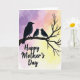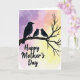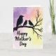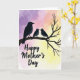 This card features three stylized birds in deep indigo and charcoal, perched close together on a slender, twisting branch that stretches across the scene. The largest bird on the left turns toward two smaller birds, their bodies angled in a way that suggests a gentle, affectionate bond ❤️. Small white highlights for the eyes add a tender, attentive look, like they’re sharing a quiet moment. Behind them, a soft watercolor-style sky shifts from rich violet on the left to blush pink near the center, then fades into warm pale yellow on the right, like early morning light. The colors feel soothing and romantic in a subtle way, as if the trio is nestled in a calm, private corner of nature. Near the lower portion, the words “Happy Mother’s Day” appear centered in dark lettering that stands out clearly against the lighter background 🌼. The branch has a gnarled texture with thin offshoots, drawn in a darker tone that contrasts against the glowing gradient sky.