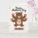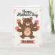 This card features a stylized bear in soft brown with rosy cheeks and a gentle, welcoming stance, as if offering a hug ❤️. A bouquet of flowers in pale pink, coral, and creamy tones rests on its light belly, adding a tender, affectionate touch to the scene. Several small rectangular gift boxes in coral float around the bear, each topped with a golden bow that feels like a shower of thoughtful surprises. The background uses vertical stripes in off-white and light peach, giving the setting a calm, cozy look. Near the top, a flowing greeting line appears in a dark tone that stands out clearly against the pale backdrop. Beneath the bear, a ribbon-like banner holds a short message in a matching dark color, centered and easy to read 🌼. A dotted border frames the design, with tiny evenly spaced dots tracing the edges in a soft coordinating shade.