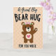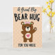 This card shows a chocolate-brown bear with round, friendly features and blush-pink cheeks, standing against a soft peach background dotted with faint lighter circles. A ring of pink roses and green leaves sits on its head, adding a gentle, affectionate touch, as if it’s dressed up for someone special. One paw lifts in a small wave that also reads like an invitation for a hug, with white paw pads visible for extra sweetness ❤️. On the bear’s chest, a crisp white circle holds a bright fuchsia heart, drawing your eye to the center like a quiet promise of closeness. Above the bear, the words “A Great Big” sit near the top in a flowing, cursive-style look in a dark tone. Across the middle, “BEAR HUG” appears in large, thick uppercase letters, and below that, “FOR YOU NIECE” is set in smaller uppercase text, keeping the layout balanced and easy to read 🌼. The roses are soft pink with layered petals, and the green leaves fan outward in a tidy crown shape.