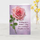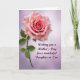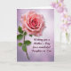 Designed with a tender floral focus, the card features a fully opened pink bloom in the upper left, with petals curling inward toward a deeper rosy center like a gentle embrace ❤️. A green stem angles down from the flower, carrying a few leafy accents that add a fresh, natural contrast. Behind it, the background fades from pale lavender near the top into a soft blush tone toward the lower right, giving the scene a calm, affectionate glow. The flower’s shading suggests a velvety texture, like something you’d lean in close to admire with a loved one. In the lower right, a short Mother’s Day message sits neatly in a dark plum color, standing out without overpowering the artwork 👩. The lettering is flowing and decorative, with the words arranged on two lines and aligned slightly to the right. A faint halo of light surrounds the bloom, and the gradient background remains smooth with no borders or patterns.