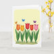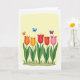 This design shows a spring garden scene on a soft buttery-yellow background, where rounded flowers line the lower part of the card like close friends leaning shoulder to shoulder ❤️. Broad green stems and wide leaves rise from a band of olive-and-forest grass, with small shaded areas under the leaves adding gentle depth. The blossoms move from warm oranges into sunny yellow, then red, coral, and a tender pink, each petal edged with a slightly darker outline for definition. Above them, three small winged creatures flutter in orange, bright blue, and violet, spaced apart as if circling one another in a light, affectionate dance 🌼. A thin white border frames the whole illustration and keeps the eye centered on the garden. There’s no text in the design, leaving open space across the upper area and along the sides for a message to be added. The grass strip sits along the bottom edge, with the five flowers arranged in a neat horizontal row beneath the trio of colorful flyers.