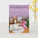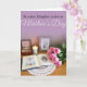 Designed with a soft lavender background, the card opens on a calm still-life scene that feels like a quiet thank-you shared between close hearts ❤️. Near the top, a short message sits centered in a gentle, darker-toned lettering that stands out clearly against the pastel field. On a warm, polished wooden tabletop, a bouquet of pink roses leans to the right, their layered petals and green leaves arranged as if set down with care after a loving visit. Beside the flowers, an open illustrated book rests on a white crocheted doily, suggesting a cozy home moment and a tender appreciation for family stories. One page shows a decorative motif, while another features an oval-framed portrait of a young person, like a keepsake glance that invites a soft smile. A candle in a textured metal holder glows nearby, casting a small pool of light that makes the scene feel intimate and gentle 🌼. To the left, an open wooden box reveals a silver-toned ornament, and a small silver frame displays delicate blue blossoms.