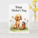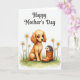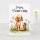 This card shows a gentle scene on a white background, where a golden, puppy-like creature with big dark eyes faces forward with a soft, affectionate look ❤️. Its fluffy fur is shaded in warm tones, giving it a cozy, cared-for presence. Beside it, a tiny spiky-coated animal peeks out from the opening of an earthy brown boot, as if sharing a shy little moment with its larger companion. A narrow band of green grass runs along the bottom, painted in a light watercolor style and dotted with small white daisies 🌼. Near the top, the words “Happy Mother’s Day” sit centered in a flowing dark gray line style, floating above the animals without a border. The open space around them makes the pair feel close and connected, like friends lingering together in a quiet spring pause. The daisies have bright yellow centers, and the boot’s shading deepens near the sole and around the rim.