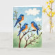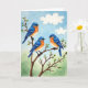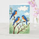 Designed with three small birds as the focus, the illustration uses soft, watery color washes that feel gentle and romantic ❤️. Each bird has a deep blue back and wings that fade into a warm peach-orange chest and then a creamy white belly, with dark eyes that seem to glance toward one another in quiet companionship. They perch close together on sturdy brown branches that curve across the scene, creating a cozy, shared space like friends huddling on a calm morning. Clusters of white blossoms with pale yellow centers and fresh green leaves dot the branches, adding a springtime freshness 🌼. The main greeting text sits near the top in a light, airy color that stands out against the sky, with a smaller line placed lower down in a softer matching tone. Behind them, the sky shifts from lighter to deeper blue with two faint, cloudlike shapes drifting near the upper area. A low band of muted green rests along the bottom edge beneath the branches and blooms.