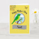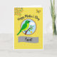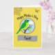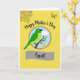 Designed with a sunny golden-yellow background sprinkled with tiny white dots, this card feels like a bright day shared with someone you care about ❤️. In the upper left, a small bouquet of orange flowers and green leaves leans into the scene, like it’s reaching in for a friendly hello. In the opposite corner, a little butterfly with golden wings hovers lightly, adding a gentle, affectionate touch. At the center sits a round picture framed by a softly textured gold ring, drawing your eye inward like a quiet moment together. Inside, a green bird with an alert eye and dark beak rests calmly on a brown branch, set against a sky-blue backdrop with one puffy white cloud drifting by. Above the circle, a short message appears in bold black lettering, while a smooth gray banner below the image holds a smaller term of endearment in darker text, with a tiny yellow flower near the branch for a sweet accent 🌼. The central vignette is bordered by a subtly shimmering, golden-textured ring.