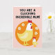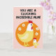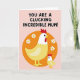 This card features a pale pink background with a large orange circle in the center, creating a sunny stage for two stylized birds standing close together ❤️. On the left, a larger bird has a white head, a bright yellow beak, and a small red crest, with its yellow body shown in layered shapes that add gentle depth. To the right, a smaller chick echoes the same colors and features, leaning in with a sweet, trusting stance that suggests a close bond. Inside the orange circle, simple daisy-like flowers are scattered around them, with white petals and yellow centers that soften the scene 🌼. Across the top, the message “YOU ARE A CLUCKING INCREDIBLE MUM!” appears in dark, heavy lettering, centered above the circle for quick focus. The contrast between the dark text, warm orange, and soft pink keeps the design easy to read while still feeling cozy and affectionate. Several small white-petaled daisies with yellow centers sit around the birds inside the orange circle.