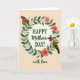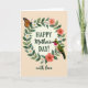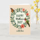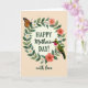 Designed with a lush circle of leafy greenery, this card centers on a botanical wreath dotted with white daisy-like flowers and coral-toned blossoms that feel like a gentle hug ❤️. Inside the wreath, the main text reads “HAPPY Mother’s DAY!” in deep green, with “HAPPY” and “DAY” in neat, simple lettering and “Mother’s” in a flowing, cursive-style word that adds a tender touch. Just below the wreath, a smaller line says “with love” in matching green, placed like a quiet note tucked beneath the main message. On the upper left curve of the wreath, an orange-and-black winged insect rests lightly, as if pausing near the flowers. On the right side, a tiny bird with a green body and a magenta throat leans in toward the wreath, wearing a small golden crown that suggests affectionate admiration 🌼. The soft peach background keeps everything warm and calm, letting the greens and corals stand out without feeling loud. The wreath’s leaves overlap in layers, with white petals and coral blooms spaced evenly around the circle.