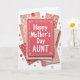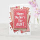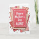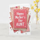 This greeting card features a deep red card placed at the center of a neatly arranged flat-lay, setting a warm, affectionate tone ❤️. Across the front, the message “Happy Mother’s Day AUNT” is printed in white, all-caps lettering, centered and easy to read. The card has scalloped edges, and just inside the border are tiny dotted and dashed marks that add a gentle, decorative frame. Underneath, several layered papers peek out in coordinated patterns, including soft florals, simple geometric repeats, scattered hearts, and loose abstract shapes that feel friendly and close. The color mix leans toward blush pinks, soft coral, muted beige, and richer reds, like a bouquet laid out on a tabletop 🌼. Around the outer area, small round buttons in reds, pinks, and natural wood tones are sprinkled like little keepsakes, balancing the patterned layers. Everything sits on a bright white background, and the red card’s scalloped edge stands out sharply against it.