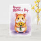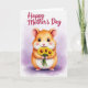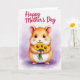 This card shows a fluffy, rodent-like creature standing upright and offering a bouquet as if sharing a gentle, affectionate moment ❤️. It has round ears, dark shiny eyes with tiny highlights, and soft rosy cheeks that make its expression feel tender and friendly. Warm orange-brown fur fades into a creamy white belly, and the little pink-toned paws curl around bright yellow, sun-like flowers 🌼. The creature’s slightly open mouth suggests a shy smile, like it’s presenting the bouquet to someone it cares about. A light purple watercolor wash spreads across the background and lightly marks the ground, keeping the scene airy and calm. Near the top, the words “Happy Mother’s Day” appear in flowing crimson lettering, centered above the character. Fine details like delicate whiskers and soft shading add depth to the plush fur, and the yellow petals pop against the muted purple backdrop. The bouquet sits close to its chest, with layered yellow blooms and small green stems gathered neatly between the paws.