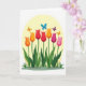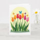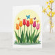 Designed with a fresh spring scene, the card features seven tall flowers growing from a lush green patch, their long stems lifting cup-shaped blooms in orange, deep red, fuchsia, and soft pink. Broad green leaves spread at the base like a cozy gathering spot, making the bouquet feel close-knit and friendly. Above the flowers, four small winged insects drift around one another, as if circling in a gentle, affectionate dance ❤️. Their wings show bright blue, purple, and warm orange accents that add little sparks of color against the calmer background. A pale yellow circle behind the bouquet reads like a soft sun or spotlight, wrapping everything in a warm glow. Any greeting text would sit neatly above the yellow circle in a simple dark tone, with a smaller line placed below the flowers in a lighter shade 🌼. Subtle shading on each petal and leaf gives the arrangement depth, while the insects hover near the top edge with wings angled outward.