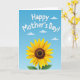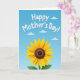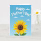 This design shows a large sunflower filling the lower part of the card, its yellow petals softly shaded around a textured brown center that feels like a cozy place to linger. A slim green stem rises from the bottom with two deep-green leaves, giving the flower a steady, grounded look. Above it, the background opens into a light blue sky that shifts gently in tone, like a calm morning shared with someone close ❤️. A few rounded white clouds drift across the upper area, spaced out to keep the scene airy and relaxed. Near the top, a short message sits centered in curving white letters, standing out clearly against the blue. The open sky and upward-facing bloom create a quiet closeness, like a warm glance exchanged between loved ones 🌼. The sunflower’s center shows tiny patterned dots and rings, with the petals fanning outward in a neat circle beneath the clouds.