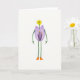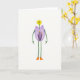 Designed with a simple white background, the artwork centers on a little figure built from flowers, standing upright like it’s ready to greet a friend ❤️. The head is a small sun-yellow, five-petaled bloom, tilted with a gentle, friendly look. Below it, a wide purple flower forms the body, its petals open to show deep violet filaments with tiny yellow tips and a curled center that feels like a secret held close. Thin bright-green stems stretch out as arms with slight hooks at the ends, as if reaching for a hand to hold. Matching green stems create long legs that give the character a shy, gangly stance, adding a sweet, bashful charm. Near the top-left, a short line of text appears in soft lavender, while a second smaller line sits beneath it in light gray, leaving plenty of airy space around the figure 🌼. At the bottom, two small pumpkin-orange boot shapes act as feet, set slightly apart under the green stems.