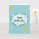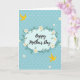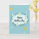 This Mother's Day card features a calm aqua-blue background with a faint pattern of small, lighter-blue flowers scattered across it. At the center sits a soft blue oval frame set horizontally, giving the layout a gentle, welcoming focus. Inside the oval, the words “Happy Mother’s Day” appear in flowing black lettering, centered and easy to read. A leafy green garland wraps around the oval, dotted with small white blossoms that have sunny yellow centers, like a quiet garden hug 🌼. Two stylized yellow birds add a sweet, companion-like touch, as if they’re circling the message together with shared affection ❤️. One bird is placed near the upper left area and the other near the lower right, creating a diagonal balance across the design. The oval frame is surrounded by green foliage and white flowers with yellow centers, with the birds positioned in the upper left and lower right corners.