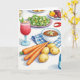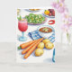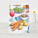 Designed with a bright still-life scene, this card shows an inviting spread of food arranged on a white tabletop, where the close placement of ingredients feels like a shared meal between friends ❤️. In the foreground, unpeeled potatoes and three orange carrots sit side by side, their gentle shadows and tidy spacing creating a cozy, cared-for look. A curved red chili pepper arcs nearby, adding a little spark of energy, like a teasing wink across the table. Off to one side, a stemmed glass holds a deep red drink with mint and thin yellow fruit slices, catching the light like a small toast. Next to it, a white bowl is filled with brown grains topped with a tiny green sprig, suggesting something hearty meant to be passed around. In the mid-ground, a green salad dotted with small white rounds and orange bits adds fresh contrast, while the lighting stays even and bright 🌼. The greeting text sits near the top in a warm red tone, and a folded blue-and-white checkered cloth rests along the lower edge of the arrangement.