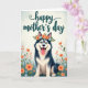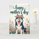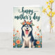 This greeting card features a fluffy dog with bright blue eyes and a wide, friendly grin, sitting calmly with its pink tongue peeking out in a way that feels like an affectionate hello ❤️. A floral wreath rests on its head, mixing coral flowers and soft sky-blue blooms with leafy green sprigs, giving the scene a sweet, companionable mood. The fur is shaded in deep blue and crisp white, with gentle texture that makes the pup look soft and huggable, like it’s leaning into a caring moment. Near the top, a flowing line of teal text is centered above the dog, standing out clearly against the pale background. Along the bottom edge, stylized wildflowers in coral and light blue rise up with green foliage, framing the dog as if friends are gathered around in a garden 🌼. The background stays light and softly glowing, like a sunny spring morning that keeps everything airy and calm. Warm coral tones balance with cool blues and greens, creating a cozy contrast that suggests closeness without needing extra words. The foreground flowers curl upward around the dog’s paws in layered clusters of coral petals, sky-blue blossoms, and small green leaves.