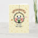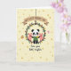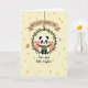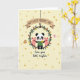 Designed with a soft creamy yellow background, the card is sprinkled with irregular polka dots in muted gold and beige for a cozy, sunny look 🌼. In the center, a black-and-white animal with round ears wears a simple green tunic and stands inside a leafy wreath, holding up a bright yellow flower as if offering it to someone special ❤️. Two small pink animal friends with rosy cheeks lean in close on either side, their gentle smiles and near-touching poses suggesting closeness and care. The wreath loops around them like an embrace, packed with green leaves, yellow sunflower faces, and scattered red-orange petals. Above the group, a curved beige banner with a darker brown underside hangs from a thin dark line, and its message appears in thick, friendly dark lettering. Beneath the characters, a second line of flowing dark text sits centered, spaced neatly under the wreath. Along the outer edges, a small brown furry animal and a tiny pink animal peek in to frame the scene. The banner arches near the top while the lower text rests just above the bottom margin in dark ink.