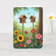 Designed with a sunny garden scene, the illustration shows two small wooden birdhouses perched side by side on slim green poles, like friendly neighbors sharing the same view. Beneath them, large yellow sun blooms with deep brown centers lean toward one another, their close spacing suggesting an easy, affectionate closeness ❤️. Around the sun blooms, red, pink, and orange daisy-like flowers fill the lower half, with soft shading that makes the petals look gently rounded. Thick green leaves and shrubs form a calm backdrop, creating a quiet edge of woodland that feels inviting rather than wild. On the right, a sturdy tree trunk rises with visible texture, grounding the scene like a steady companion nearby. Near the top, two striped winged insects hover close together as if keeping pace in midair, adding a light touch of companionship 🌼. A thin decorative border frames the artwork, and there is no text shown anywhere on the design.