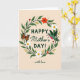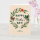 Designed with a soft peach background, this Mother’s Day card centers on a circular wreath of dark green leaves and thin branches that gently wraps around the message like an embrace ❤️. Tucked into the greenery are white daisy-like flowers with sunny yellow centers, coral-orange blossoms, and small red buds that add a cozy, affectionate touch. On the left side of the wreath, an orange-and-black winged insect rests with its patterned wings angled as if pausing near the flowers. On the right, a tiny green bird with a bright pink throat hovers close, its slim beak tipped toward the blooms as though sharing a quiet moment. The main text sits inside the wreath, with “HAPPY” at the top and “DAY!” at the bottom in dark green, all-caps lettering. “Mother’s” appears in the center in a flowing dark green style, and “with love” is placed below in smaller matching text, like a gentle whisper 🌼. The wreath’s leaves overlap in places, with blossoms nestled between stems and a few buds pointing outward around the circle.