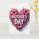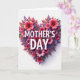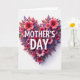 This greeting card features a heart-shaped arrangement of flowers and leafy sprigs centered on a bright white background, with blossoms clustered closely as if gathered with care ❤️. The heart is filled with layered petals in pink, fuchsia, and deep red, and the foliage shifts between muted plum and soft green-brown tones for gentle contrast. Across the middle of the floral heart, the text “MOTHER’S DAY” sits in uppercase white letters, positioned horizontally and standing out with a slightly raised, layered look. Soft, diffused lighting creates delicate shadows that tuck between petals and leaves, giving the bouquet a cozy, affectionate feel like a quiet hug in flower form 🌼. Subtle shading makes some petals look velvety, while fine veins in the leaves add crisp detail without feeling harsh. The deeper reds and plums sit beside lighter pink blooms, creating a tender push-and-pull that feels like closeness and care woven into the design. The centered heart remains the main focus, framed by open white space that keeps the layout airy and calm. The floral heart is packed with mixed blossoms and foliage, with the white title cutting cleanly across its center.