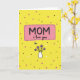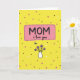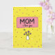 This greeting card features a sunny yellow background sprinkled with small magenta and white hearts and a few tiny black star-like marks, giving it a light confetti feel ❤️. Near the top, a soft pink rounded rectangle sits like a speech bubble, edged with a dashed outline. Centered inside, the word “MOM” appears in black uppercase letters, with “i love you” written just beneath it in a flowing black style that feels like a gentle whisper. Below the message, a simple white vase holds a small bouquet of lavender flowers with slim green stems, arranged as if freshly set down for someone special. A tiny winged insect hovers nearby, as if drawn in by the flowers, adding a sweet little moment of closeness 🌼. The scattered hearts around the page make the scene feel like a quiet celebration, like a note left where it will be found with a smile. The vase sits beneath the pink text bubble, with the bouquet reaching upward toward the words.